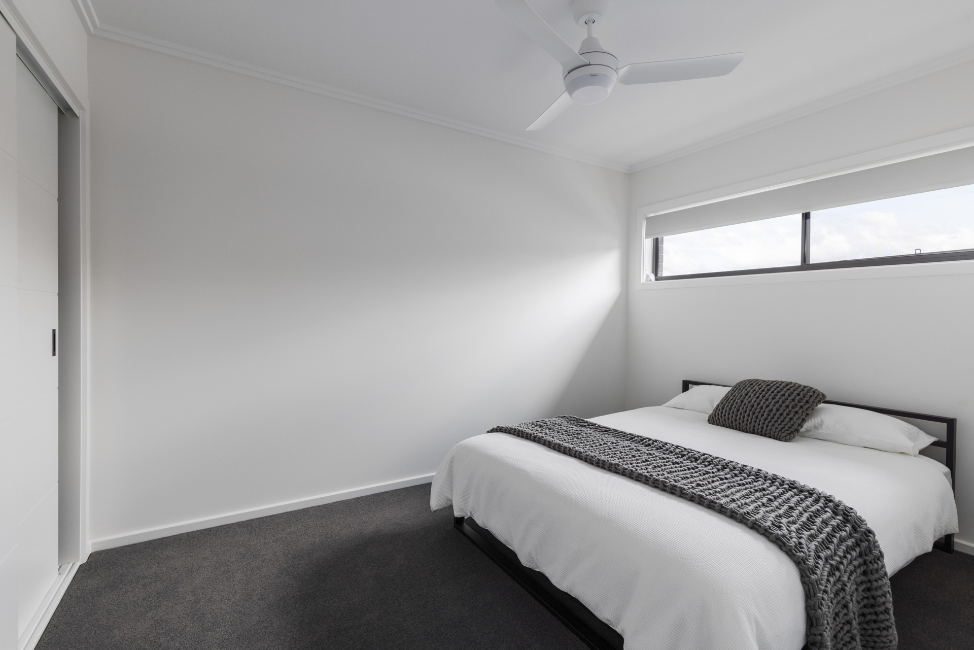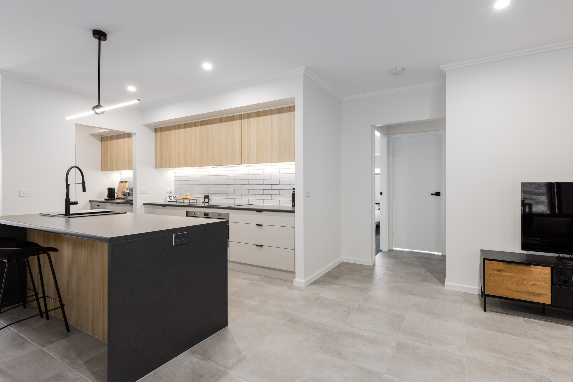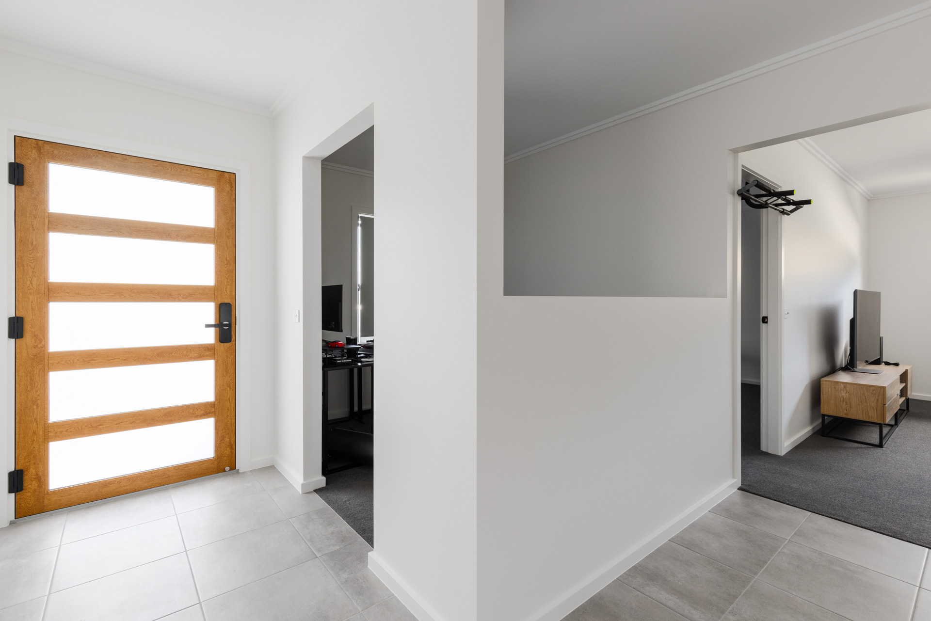 This new home was undertaken with GJ Gardner Homes, and we are so proud at how this house turned out for Michael. Located on the high side of the street this house really stands out for the rest with its 2 styles of cladding and Grano Sahara Texture finish both in Colourbond Monument really makes this house bang from the start. On the interior Michael selected the natural colours of Snowy Mountain ¼ Strength on walls and the same on doors and woodwork with a satin finish giving them a subtle but not overpowering contrast to the walls, allowing his selection of tiles, kitchen benchtop and cupboards really marry in with his paint colour selections. We formed a great relationship with Michael having been back since handover to make slight adjustments, freshen up areas and give his garage floor a real pop with an Epoxy Enamel finish.
